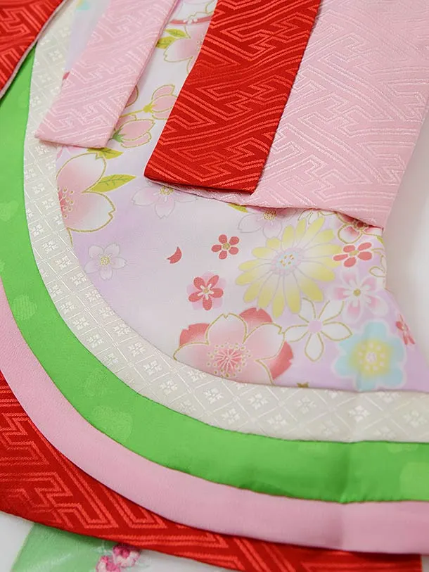 こだわりの桜刺繍入りオーガン生地の裳風の飾り布に、淡い色の襲(かさ)ねが華やか。 お釵子(さいし)風のヘアバンドで平安時代のお姫様に変身♪
