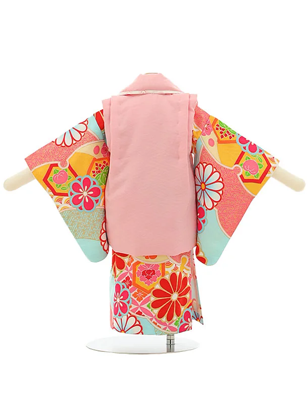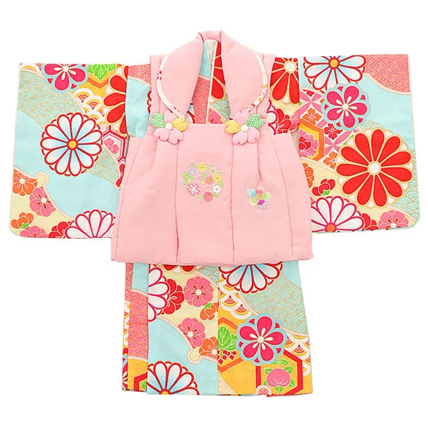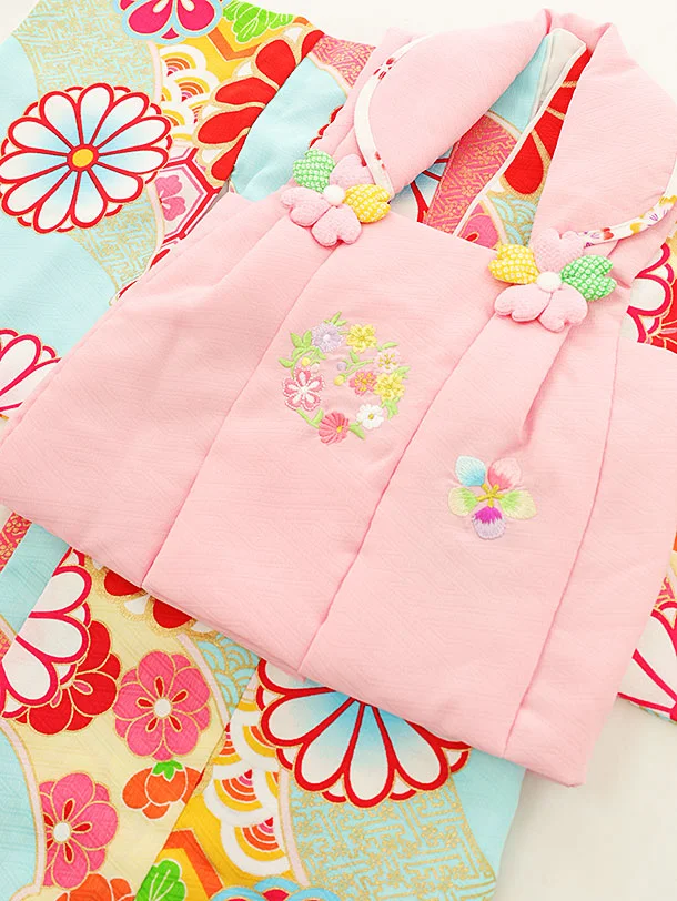 女児【1歳前後】0100 ピンク刺繍花丸×水色梅菊/セパレート