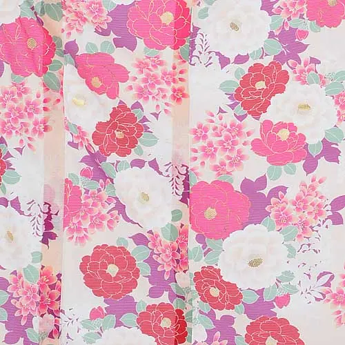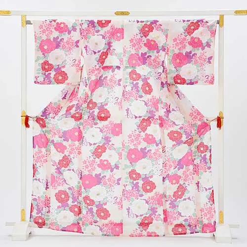 夏小紋レンタル 絽 0074白地ピンク八重椿(化繊)