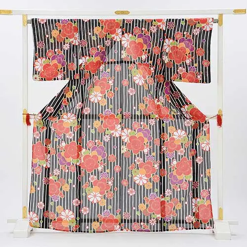 夏小紋レンタル 絽 0079黒地縞花(化繊)