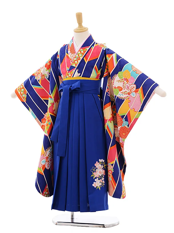 女児袴レンタル(7歳)7681 小町kids ブルー 矢柄に花丸×ブルー袴