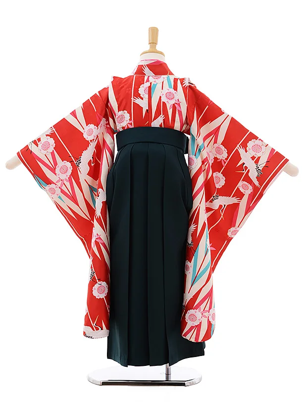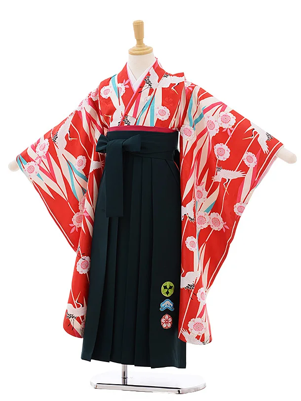 女児袴レンタル(7歳)7685 小町kids 赤地 矢柄 桜鶴×グリーン袴