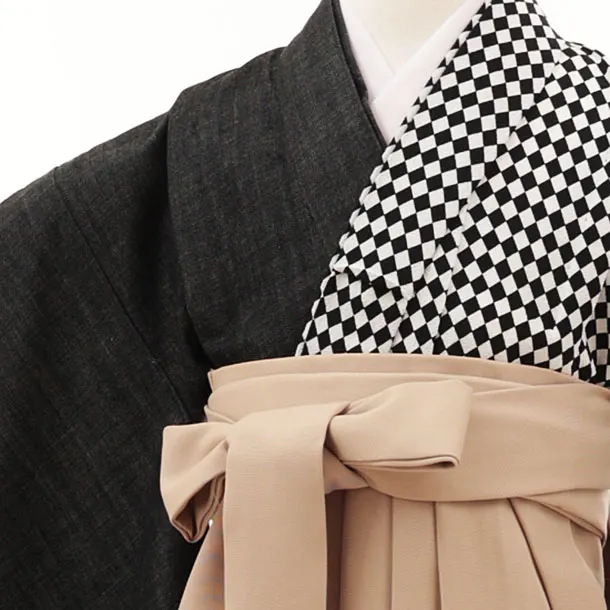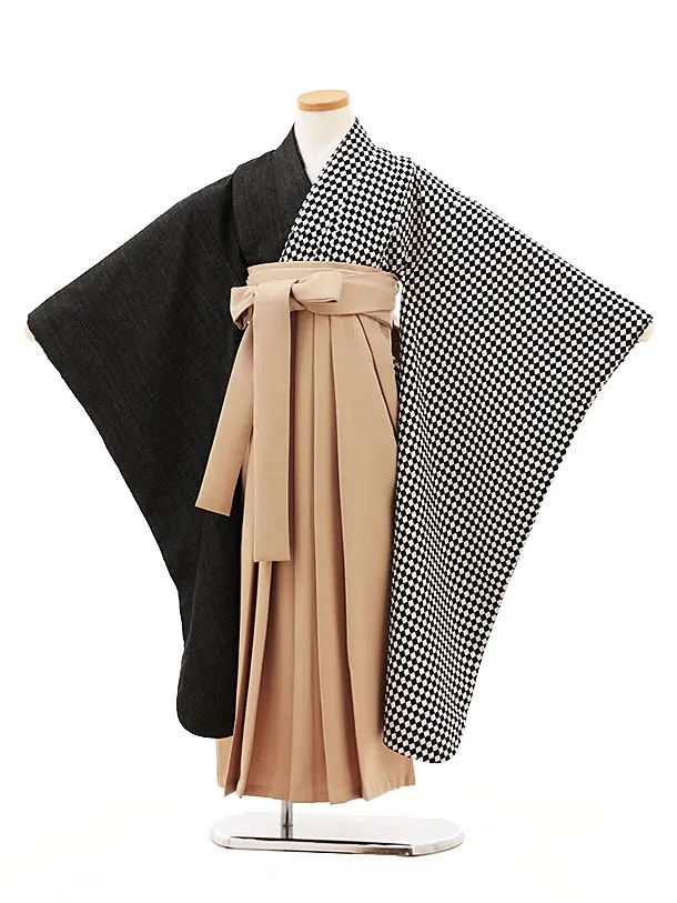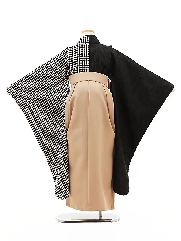 女児袴レンタル(7歳)Y308 黒 白片身替り×ベージュ袴