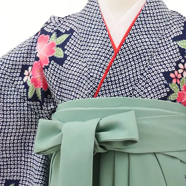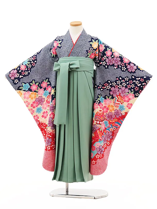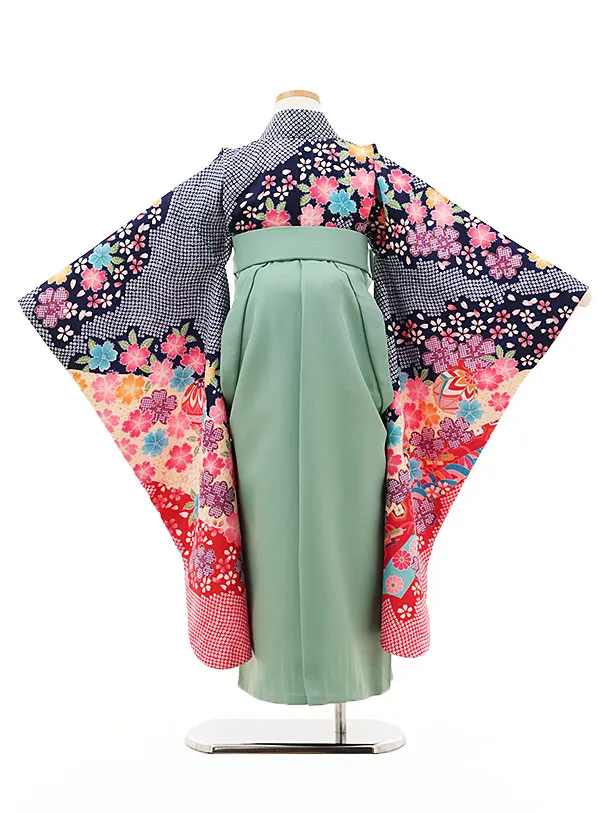 女児袴レンタル(7歳)Y311 紺地 花鼓×ペールグリーン袴