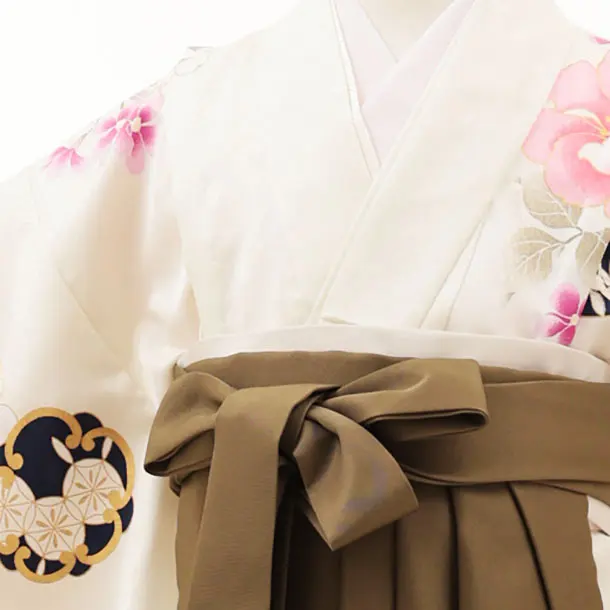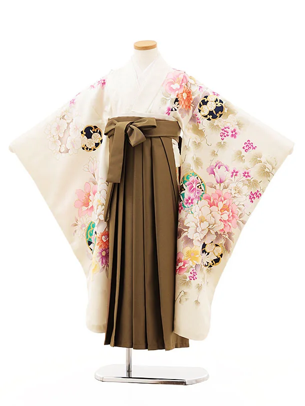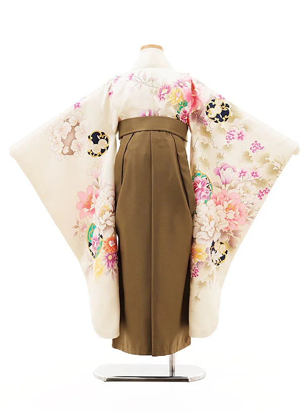 女児袴レンタル(7歳)Y324 オフホワイト地 花づくし×モカブラウン袴