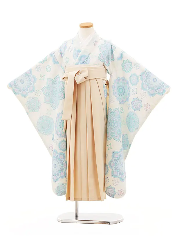 女児袴レンタル(7歳)Y350 オフホワイト ブルー更紗×アイボリー袴