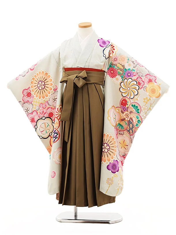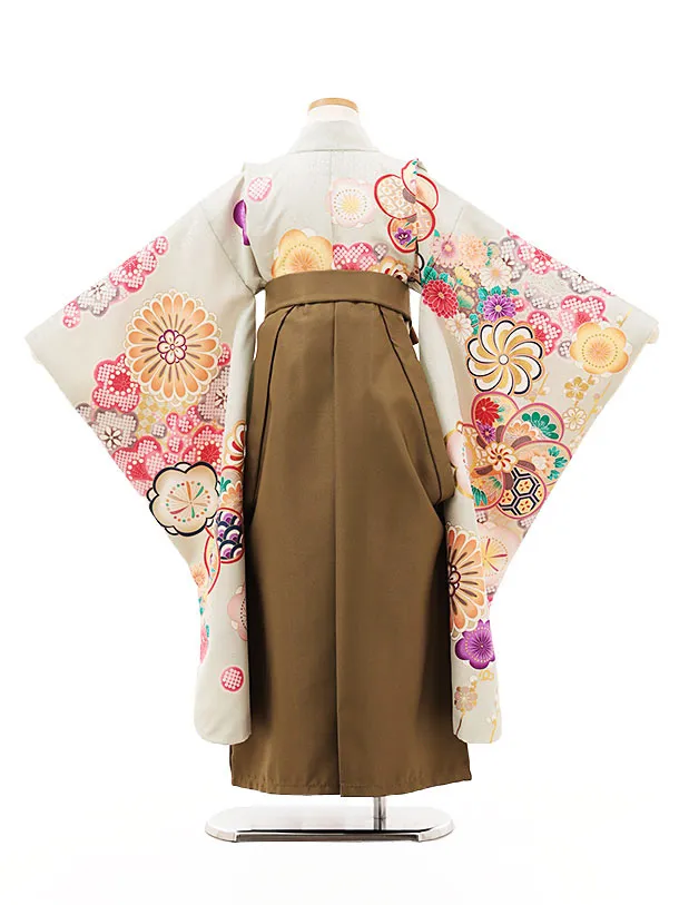 女児袴レンタル(7歳)Y351 ヒワ色 ねじり梅菊×モカブラウン袴