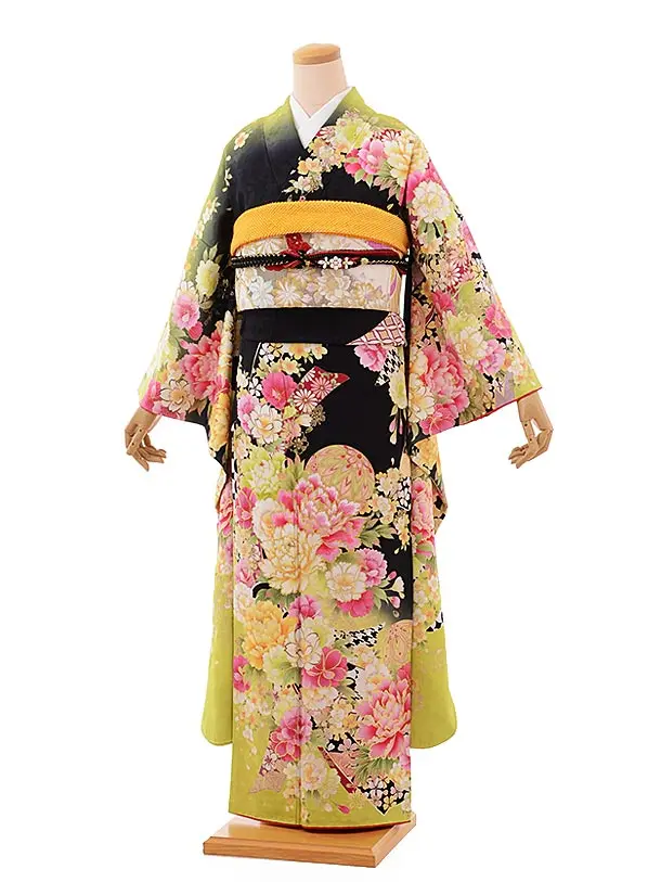 振袖レンタル615ブラック×ライムグリーン花鞠