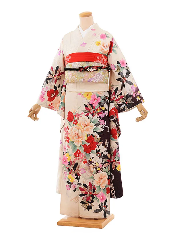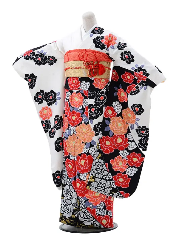 振袖レンタル706白地に赤黒バラ