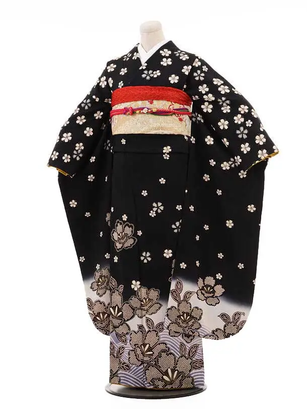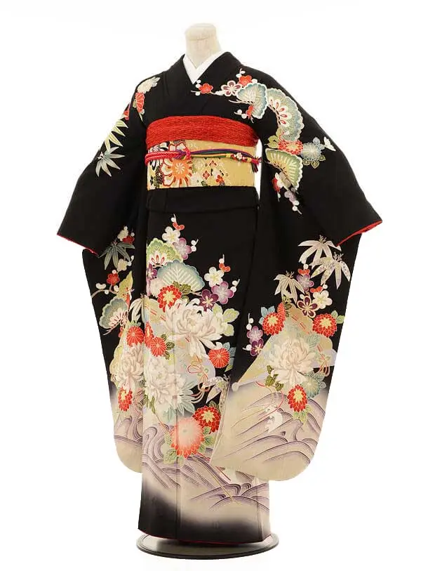 振袖レンタル1375 九重 黒地 松菊 牡丹