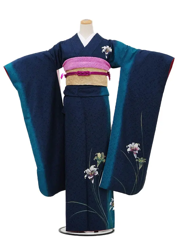 振袖レンタル375鉄紺グリーン染め分け百合の花
