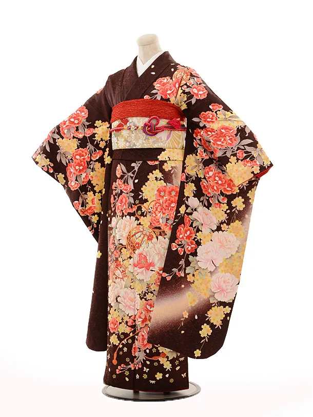 振袖レンタル1465 ダークブラウン 牡丹椿