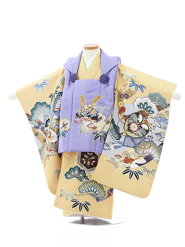 七五三レンタル(3歳男児被布)2720ベージュ地兜x黒疋田柄吉祥文様
