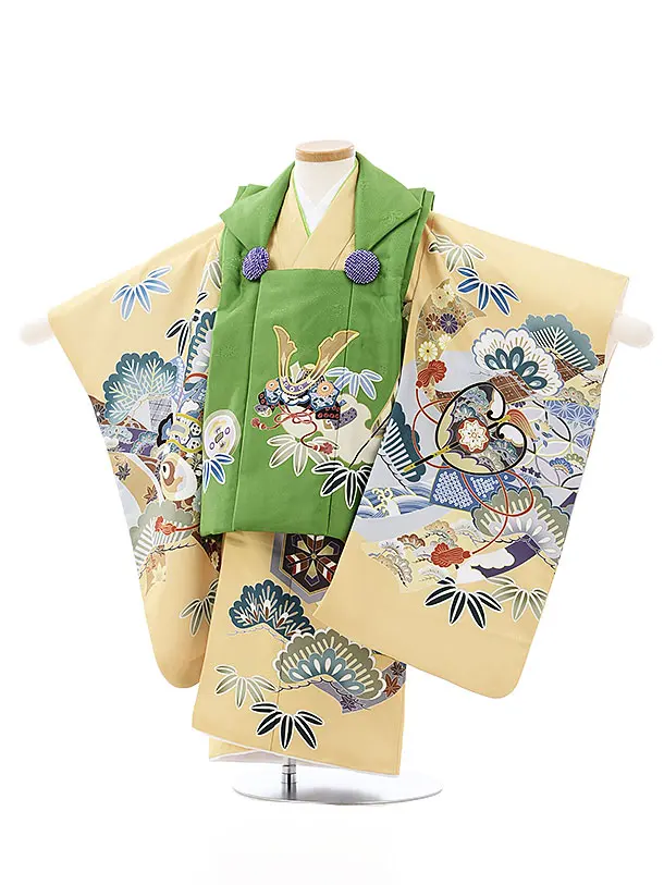 七五三レンタル(3歳男児被布)2761淡グリーン兜刺繍x茶色梅