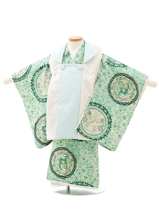 七五三レンタル(3歳男児被布)2751九重 白水色xグリーン更紗