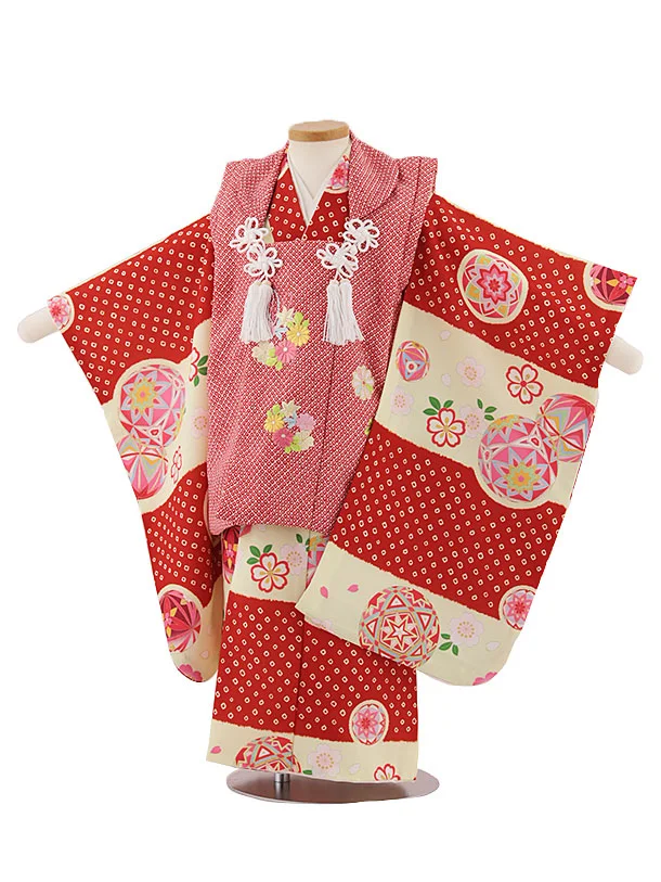 七五三レンタル(3歳女児被布)4593 赤疋田柄刺繍花×赤地クリーム鞠
