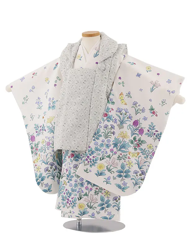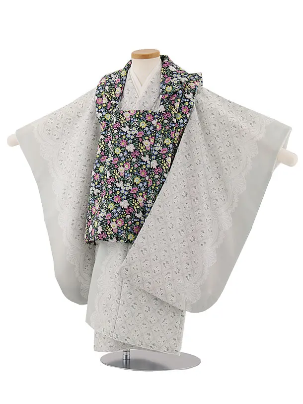 七五三レンタル(3歳女児被布)4595 グレー×白地四季草花