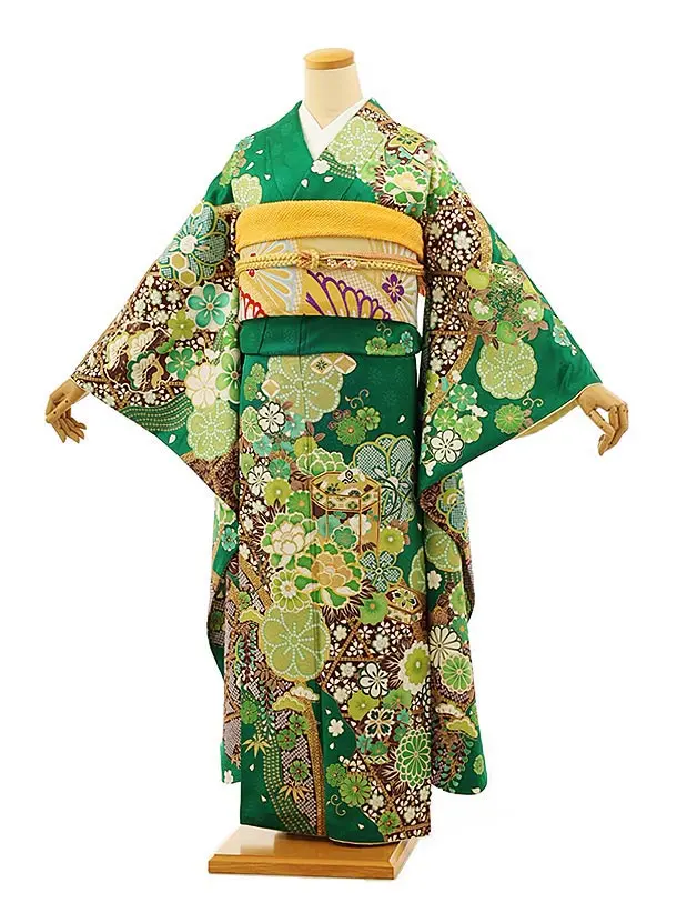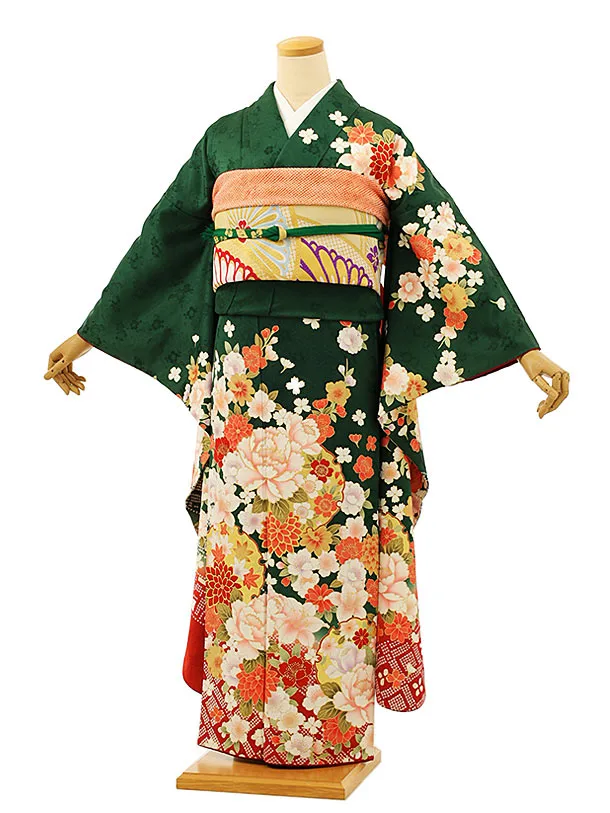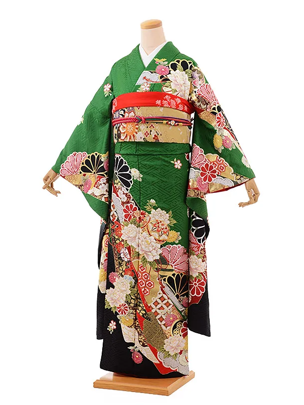 振袖 1032 グリーン地 まりのしめ ぼたん
