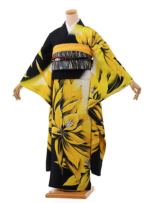 振袖レンタル1083 山吹色 紅型 椿蝶