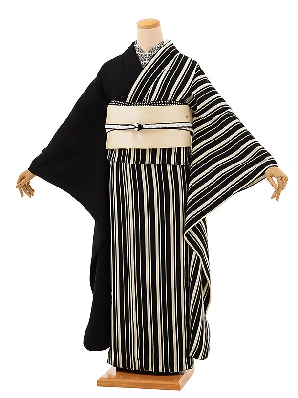 振袖レンタル1092 黒ベージュストライプアシンメトリ