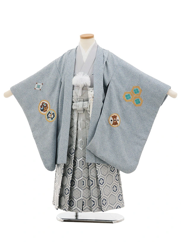 七五三(5歳男袴)X846 ブルーグレー疋田柄刺繍鷹兜×銀紺亀甲