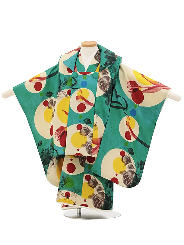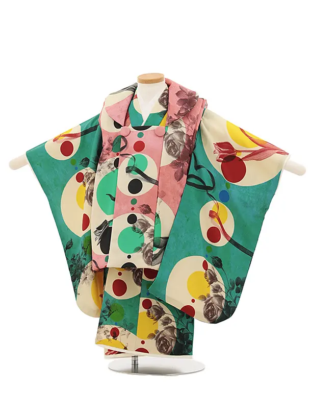 七五三(3歳女児被布)O197【germer】連なる円グリーン×ピンク