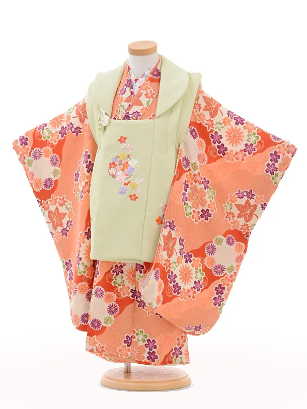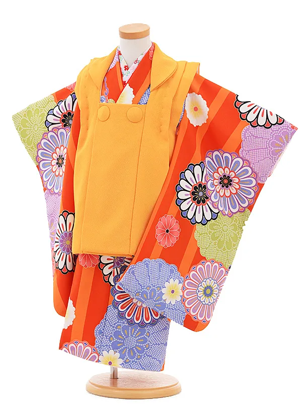 七五三レンタル(3歳女の子被布)3281オレンジ×赤縞菊