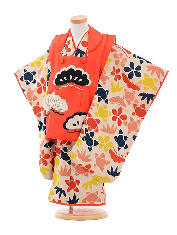 七五三レンタル(3歳女の子被布)3283レトロクリーム椿×赤