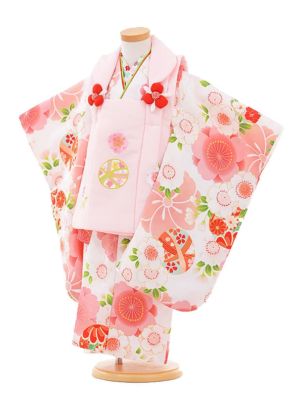 七五三レンタル(3歳女の子被布)3259白×ピンク花に鼓