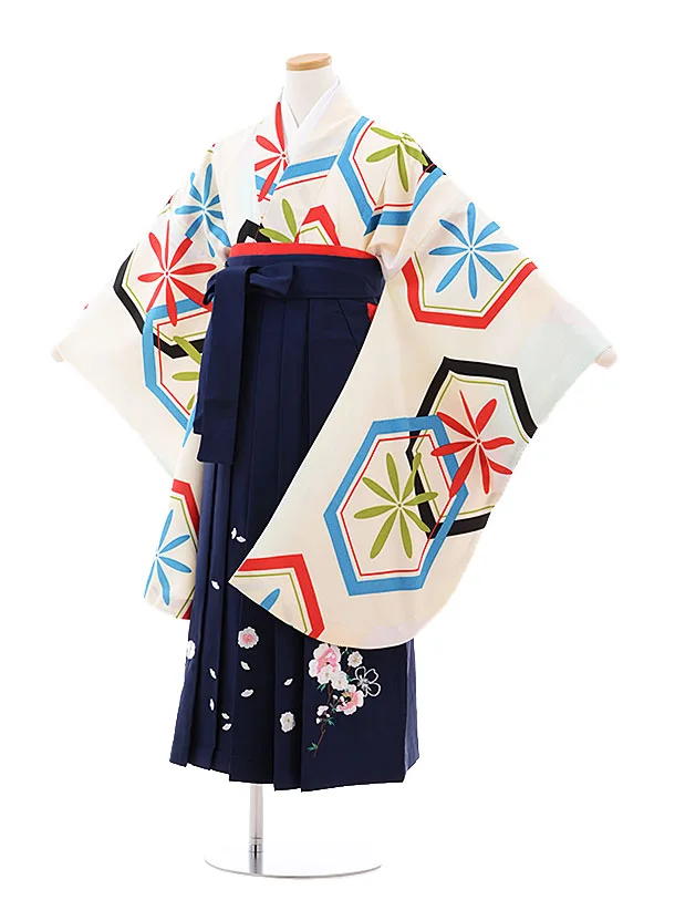 小学校卒業式袴レンタル(女の子)9756 クリーム地亀甲花×紺袴