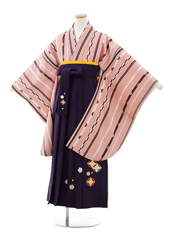 小学校袴レンタル(女児)9788ベージュピンク地ストライプ×パープル