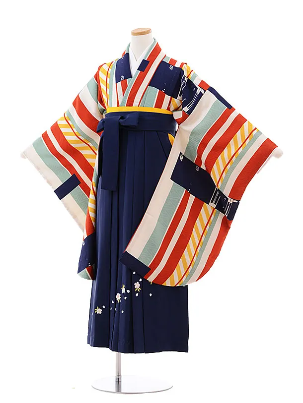 小学校卒業式袴レンタル(女の子)9798 クリーム地モダンストライプ×紺袴