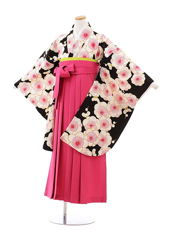 小学校卒業式袴レンタル(女の子)9803 黒地梅×ピンク袴