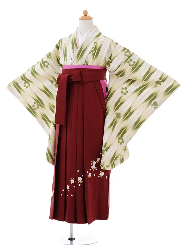 小学生卒業式袴レンタル(女の子)9401白地緑矢絣×エンジ袴