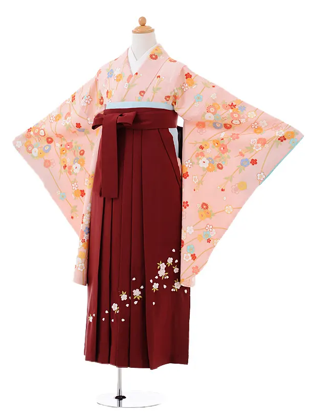 小学生卒業式袴レンタル(女の子)9410ピンク地小花×エンジ袴