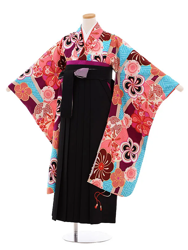 小学生卒業式袴レンタル9486九重ターコイズ梅×黒袴