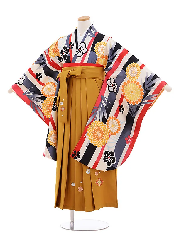 小学校卒業式袴レンタル(女の子)9658白地ストライプ菊×金茶袴