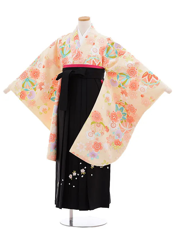 小学校卒業式袴レンタル(女の子)9665クリーム地まり花×黒袴