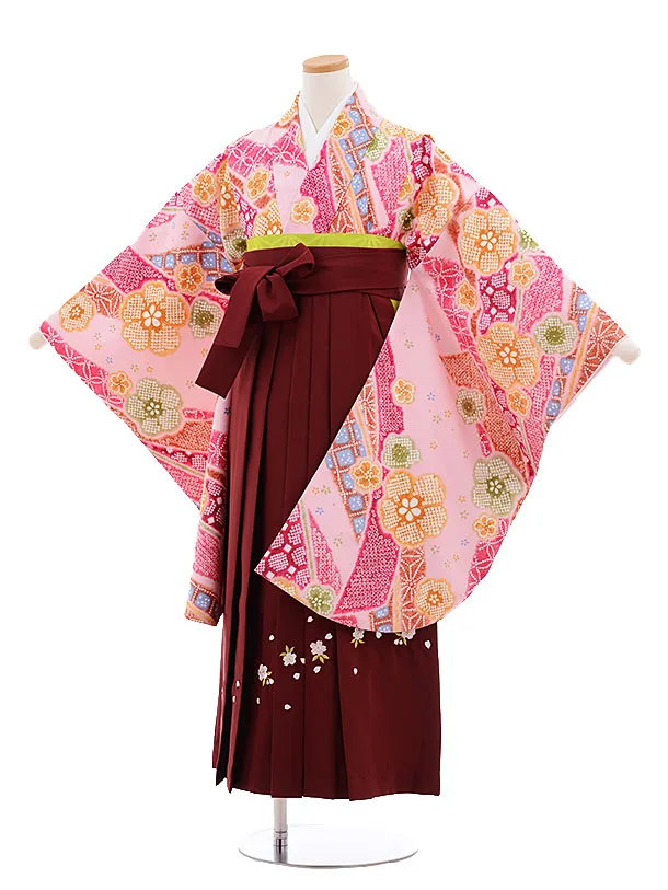 小学校卒業式袴レンタル(女の子)9675ピンクのしめ鹿の子×エンジ袴