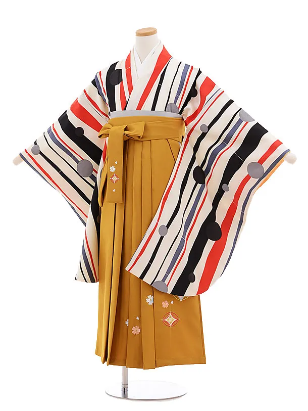 小学校卒業式袴レンタル(女の子)9690白黒ストライプ水玉×金茶袴