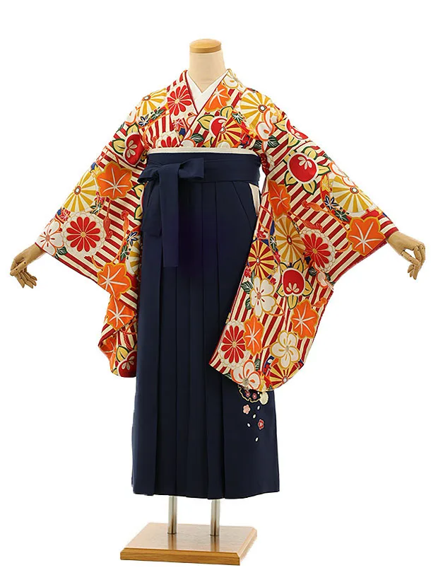 小学生袴Z192 赤ストライプ梅桜菊×紺袴