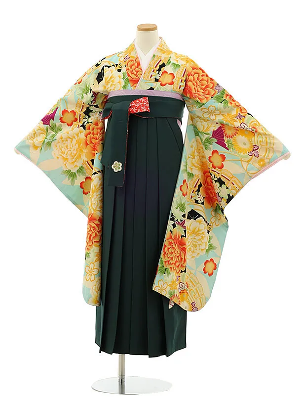小学生袴Z206 クリーム地牡丹×グリーン袴