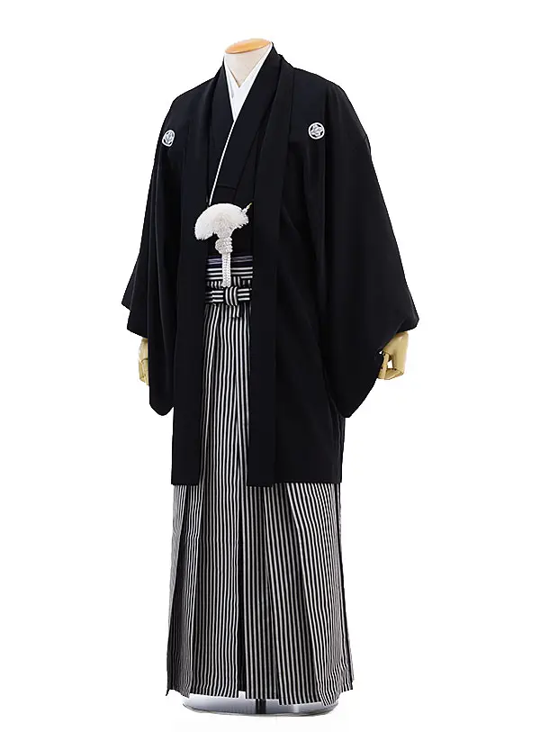 男性用袴レンタル men0006黒紋付×白黒縞(3S)/150~155㎝