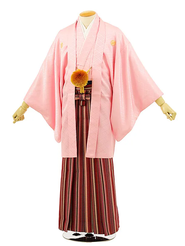 男性袴レンタル0231 ピンク紋付×赤ストライプ袴