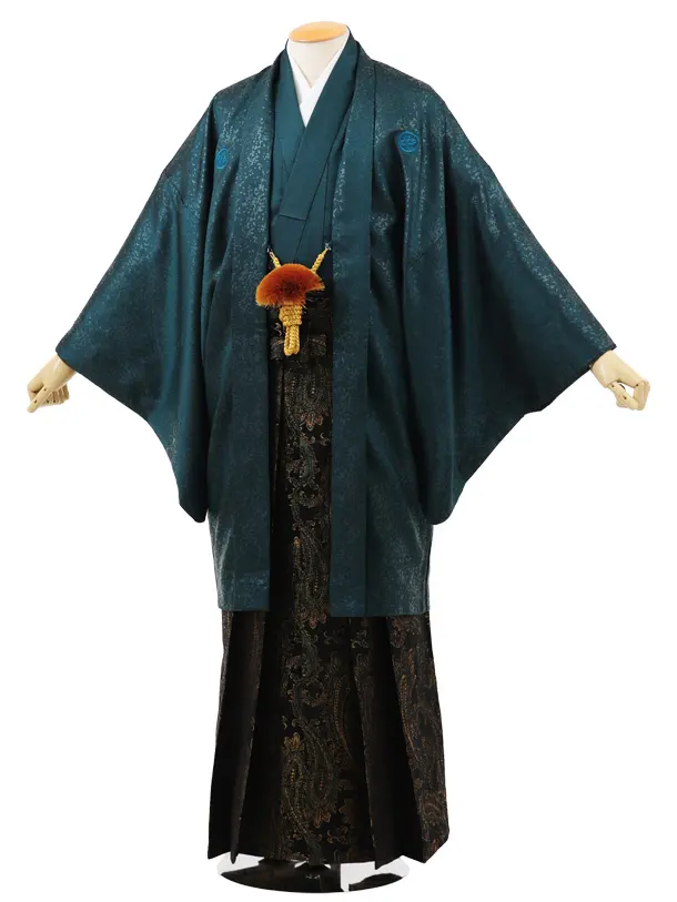 男性袴レンタル0295 グリーン紋服×黒金ペイズリー