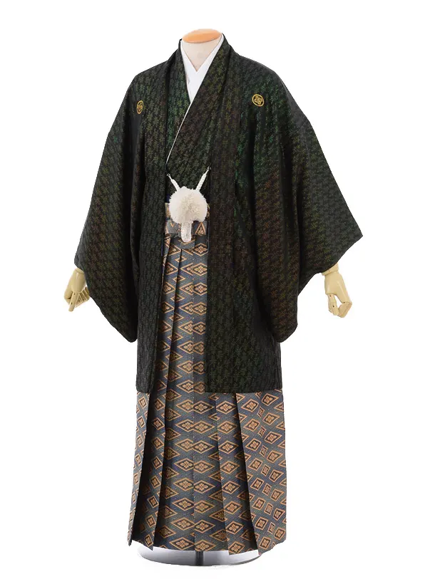 男性袴レンタル0298 からし色紋服×黒金緑ペイズリー