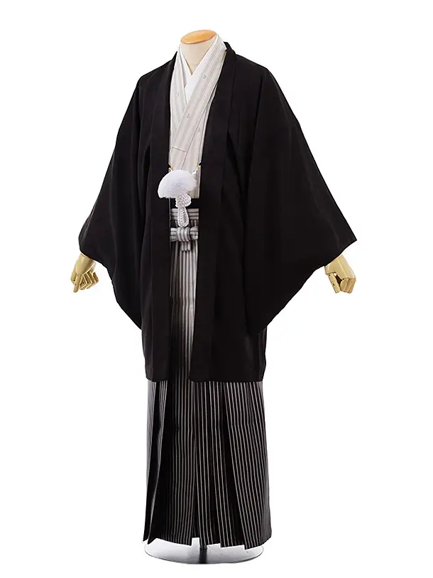 男性用袴レンタル men0006黒紋付×白黒縞(L)/170~175㎝