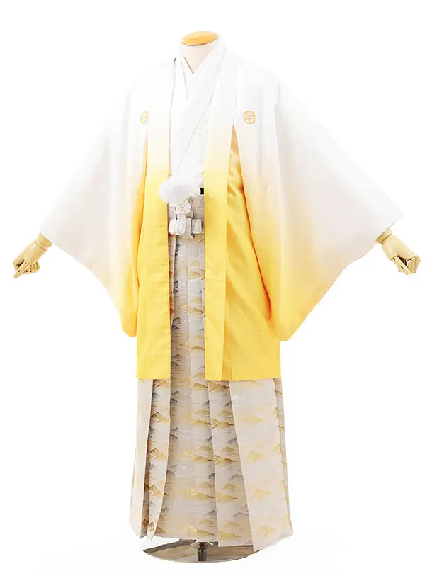 男性袴レンタル0238 白イエローぼかし紋付×シルバーゴールド