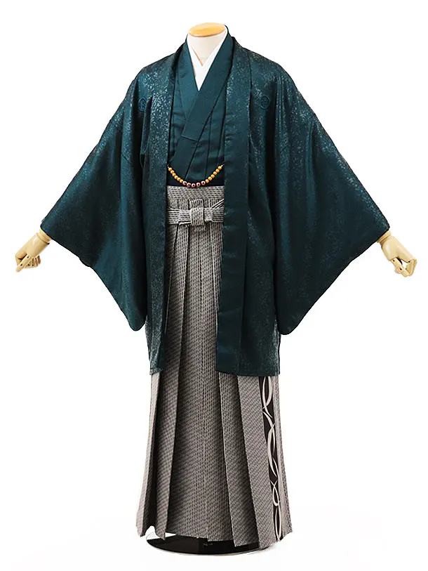 男性袴レンタル0253 ブルーグリーン紋付×ベージュストライプ