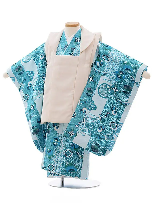 七五三レンタル(3歳男児被布)2360 ラメアイボリー×ターコイズ地 宝船